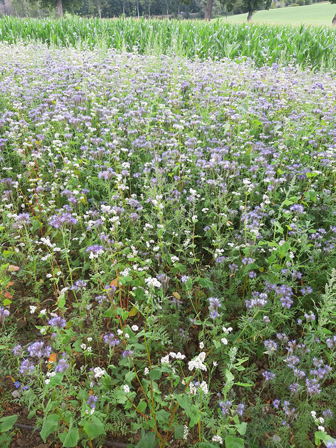 Durch Einsatz unterschiedlicher Samenmischungen ist die Artenvielfalt entsprechend hoch. Unter anderem gibt es 1-jährige und 2-jährige Pflanzen, wie Phacelia, Buchweizen, Knöterich, Sonnenblume, Kornblume, Leinen, Malve, Dill, wilde Möhre, Lichtnelke und so weiter. Entscheidend für die Auswahl der Pflanzen ist der Nutzwert für die Insekten.